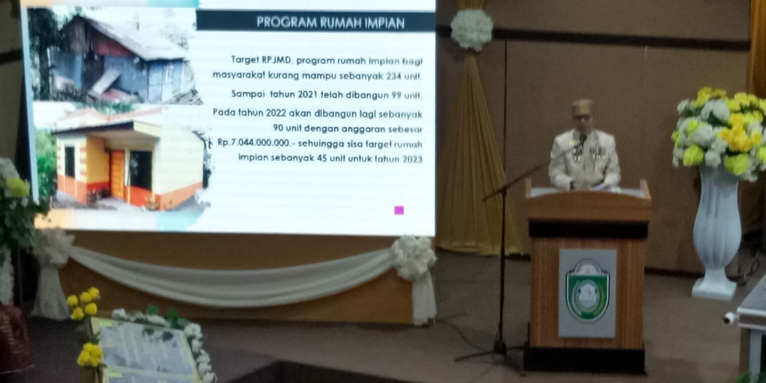 “Target RPJMD 2018 hingga 2023, program rumah impian bagi masyarakat kurang mampu sebanyak 234 unti. Sampai tahun 2021 telah dibangun 99 unti. Dan tahun 2022 ini, akan dibangun sebanyak 90 unit rumah impian,” paparnya.