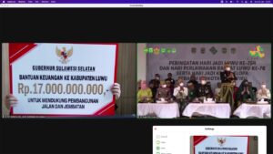 “Rp 17 Miliar anggaran Bantuan Keuangan Provinsi Sulsel tahun 2022 kita kucurkan kepada Kabupaten Luwu sebagai upaya pembangunan pasca jatuhnya Jembatan akibat banjir di akhir tahun kemarin, jalan penghubung ruas Palopo pantilang rantepao pada ruas Luwu, perbaikan asrama terbakar IPMIL serta penanganan stunting,” ujar Andi Sudirman yang disambut tepuk riuh para tetamu di Luwu.