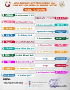 Seperti informasi terkait Jadwal Dokter Poliklinik Rawat Jalan RSUD Andi Makkasau Kota Parepare pada Selasa, 18 Juli 2024. Informasi tersebut disampaikan melalui akun medsos resmi RSUD Andi Makkasau.