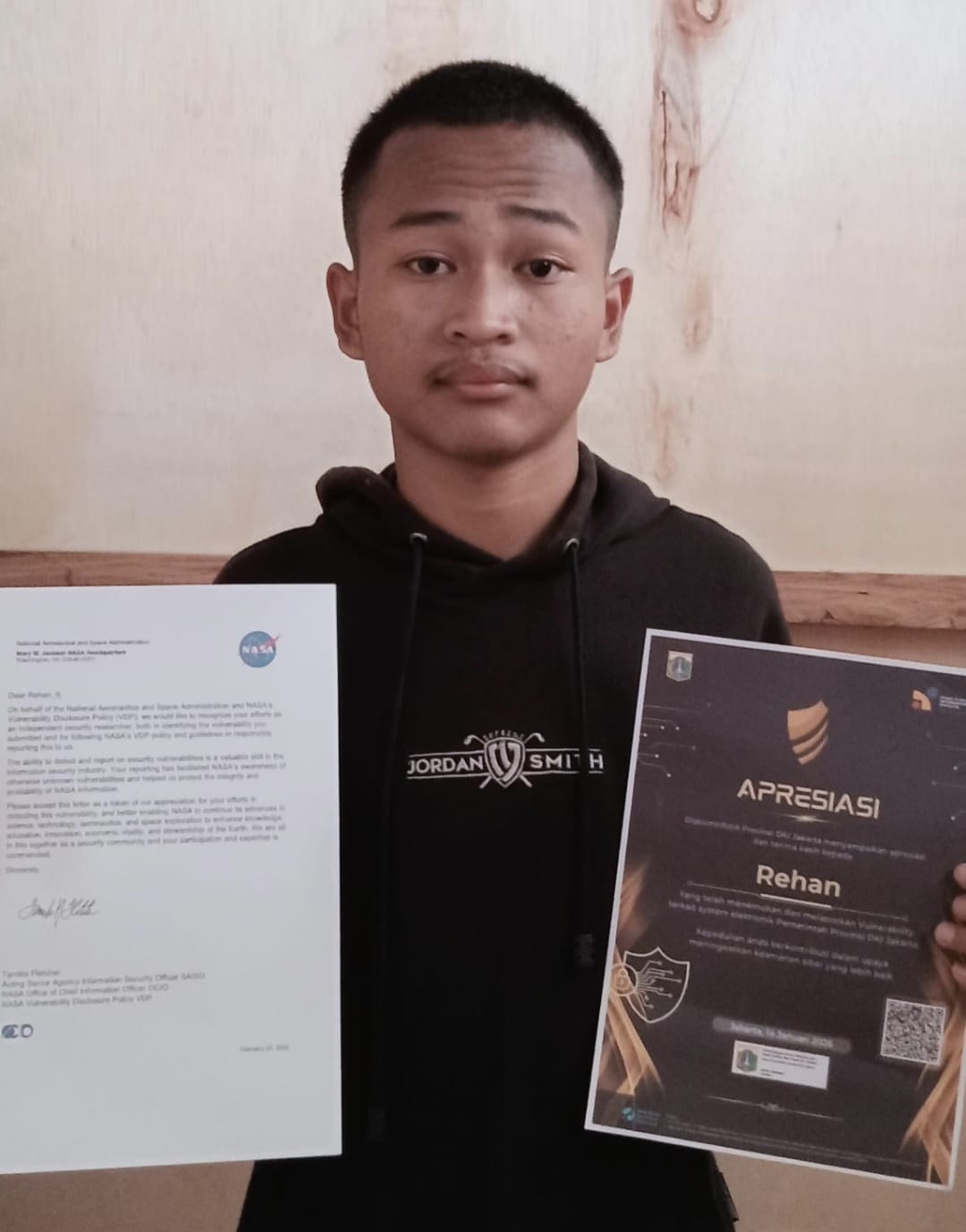Pencapaian Rehan tak hanya di NASA, karena kontribusinya dalam menjaga keamanan siber juga telah diakui secara resmi dengan diberikannya sertifikat apresiasi serta surat pengakuan resmi atas temuan saya dari TU Dresden di Jerman, University of Oslo, dan San Diego State University, hingga universitas ternama di Indonesia seperti Universitas Brawijaya, Undip, dan Unair.