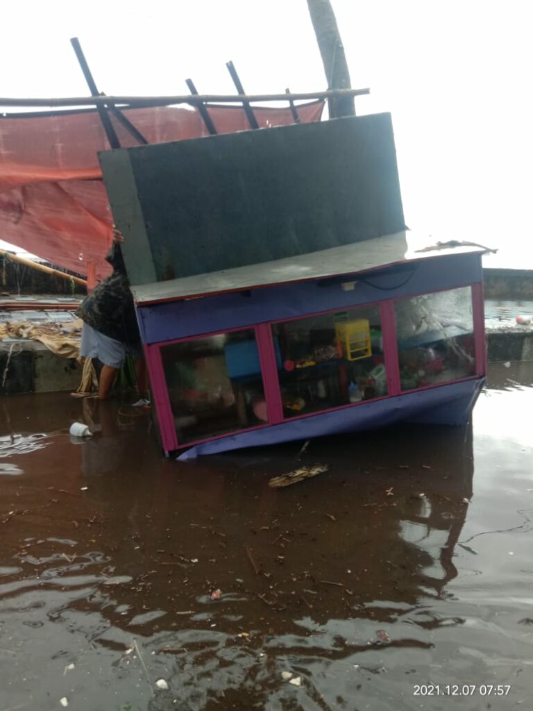 Gerobak itu rusak akibat diterpa ombak. Semakin diperparah dengan kondisi hujan dan angin kencang.
