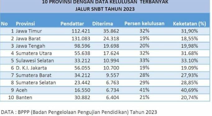 Untuk posisi 10 besar dimulai dari Provinsi Jawa Timur, Jawa Barat, Jawa Tengah, Sumatera Utara dan Sulawesi Selatan. Lalu disusul DKI Jakarta, Sumatera Barat, Sumatera Selatan, Aceh dan Banten. Gubernur Sulsel memberikan selamat kepada seluruh siswa yang berhasil diterima di perguruan tinggi negeri.