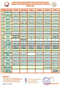 PAREPARE,PIJARNEWS.COM-Rumah Sakit Umum Daerah (RSUD) Andi Makkasau Parepare membagikan jadwal terbaru pelayanan Dokter poliklinik rawat jalan. Kamis, (27/07/2023).