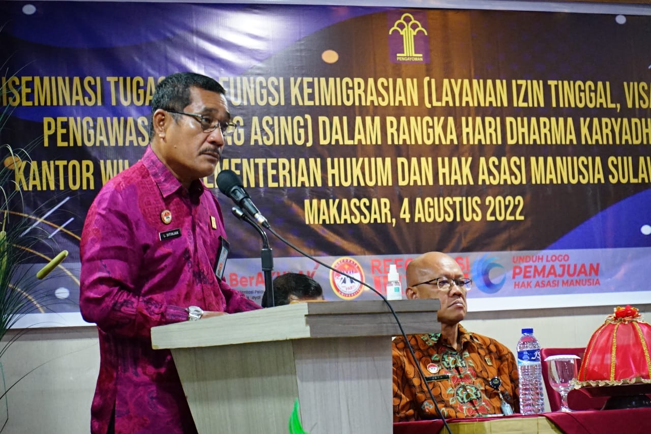 MAKASSAR, PIJARNEWS.COM— Kantor Wilayah Kementerian Hukum dan HAM Sulawesi Selatan menggelar diseminasi tugas dan fungsi (Tusi) keimigrasian di Hotel Lynt, Kamis (4/8/2022).
