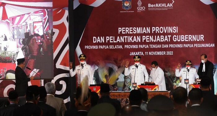 “Dengan rahmat Tuhan Yang Maha Esa, pas hari ini Jumat 11 November saya Muhammad Tito Karnavian Mendagri atas nama Presiden, dengan ini meresmikan Provinsi Papua Selatan berdasarkan UU No 14 tahun 2022, Provinsi Papua Tengah berdasarkan UU No 15 tahun 2022 dan Provinsi Papua Pegunungan berdasarkan UU Nomor 16 tahun 2022,” ujar Tito di Kantor Kemendagri, Jakarta Pusat, Jumat (11/11/2022).