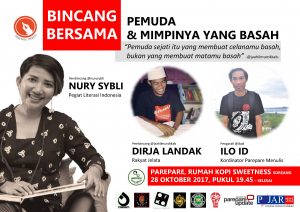 PAREPARE, PIJARNEW.COM – Nury Sybli, salah satu pegiat literasi yang juga peraih penghargaan Wanita Inspiratif Indonesia. Setelah menjelajahi pedalaman Kajang hingga ke Kahaya Bulukumba sampai ke pedalaman Kabupaten Sinjai dijadwalkan bincang bersama komunitas di Parepare pada hari sumpah pemuda, 28/10/2017 pukul 19.45 di Rumah Kopi Sweetness Soreang Kota Parepare.