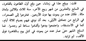 Aku berkata : dan terjadi pada zaman kami, ketika awal merebaknya penyakit tha’un di Mesir, pada tanggal 27 Rabi’ul akhir tahun 833. Adalah jumlah yang meninggal ketika itu kurang dari 40 orang. Maka mereka keluar di tanah lapang tepat pada tanggal 4 Jumadil ula, setelah menunaikan puasa selama 3 hari sebagaimana pelaksanaan istisqa (shalat minta hujan). Mereka berkumpul dan berdoa dan sesaat mendirikan shalat, kemudian kembali. Tatkala sebulan berlalu maka orang yang meninggal di Mesir melampaui seribu perhari, dan terus bertambah (karena terjangkiti).