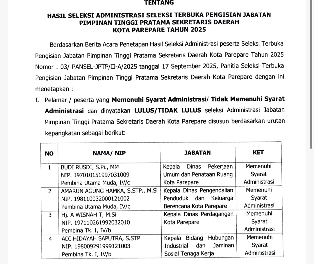 PAREPARE, PIJARNEWS. COM–Panitia Seleksi Jabatan Pimpinan Tinggi Pratama (JPTP) resmi mengumumkan hasil seleksi administrasi kandidat Sekretaris Daerah (Sekda) Kota Parepare, hanya empat pejabat yang dinyatakan lolos untuk melangkah ke tahap selanjutnya.