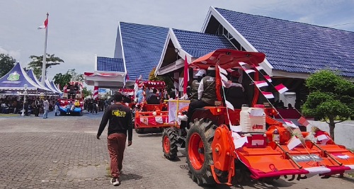 Parade alsintan yang dimodifikasi dengan desain unik semakin semarak dengan pengemudi berpakaian ala petani dan ibu-ibu berbusana khas Bugis.