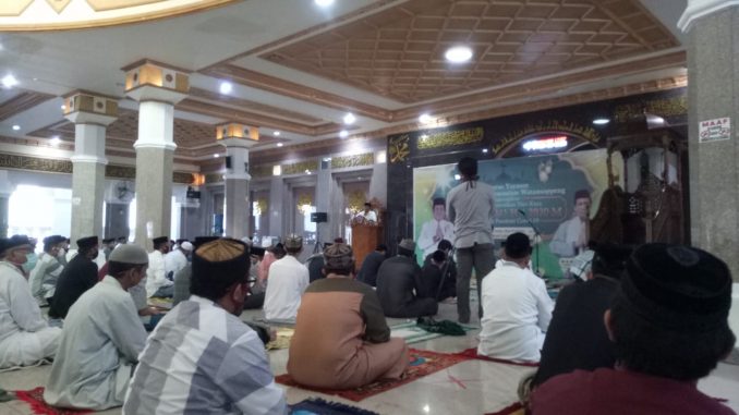 SOPPENG, PIJARNEWS.COM — Jajaran Pemerintah Kabupaten Soppeng bersama ratusan warga menggelar Salat Idul Fitri di Mesjid Agung Darussalam Watansoppeng, Ahad (24/5/2020). Sebelum memasuki masjid, seluruh jemaah harus menjalani protokol kesehatan guna mencegah penularan Virus Covid-19. Di dalam mesjid, para jemaah juga mengatur jarak.