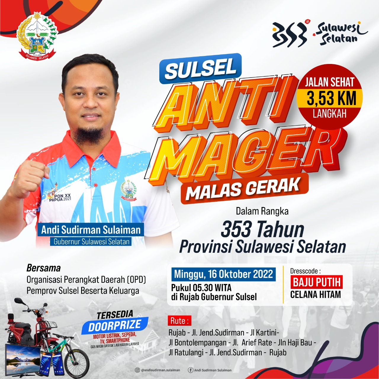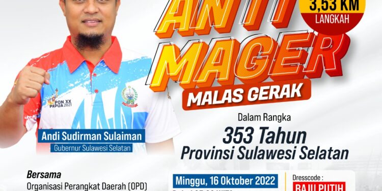 MAKASSAR, PIJARNEWS.COM— Puncak hari jadi ke-353 Provinsi Sulsel juga akan diwarnai dengan kegiatan lebih meriah lagi dengan adanya jalan sehat Anti Mager (Malas Gerak) yang diprakarsai oleh Gubernur Sulsel Andi Sudirman Sulaiman. Pelaksanaan jalan sehat antimager ini akan dilaksanakan pada Minggu (16/10/2022) di Kota Makassar.