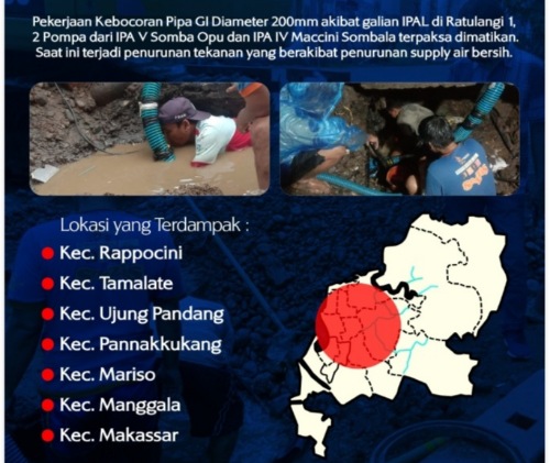 MAKASSAR, PIJARNEWS.COM–Pipa GI akibat galian IPAL di Ratulangi I, Kota Makassar mengalami kebocoran, akibatnya suplai air bersih Perusahaan Umum Daerah Air Minum (PDAM) Kota Makassar di tujuh kecamatan di Kota Makassar terganggu. Tujuh