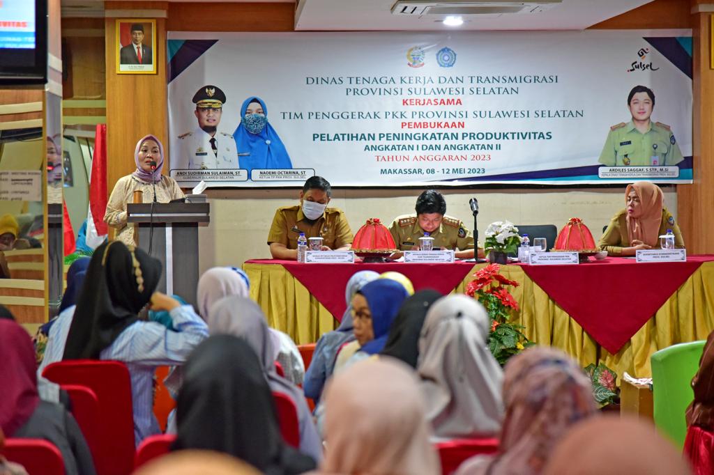 MAKASSAR, PIJARNEWS.COM– Dinas Tenaga Kerja dan Transmigrasi  (Disnakertrans) Sulawesi Selatan (Sulsel) bekerja sama  Tim Penggerak (TP) PKK Sulsel menggelar Pelatihan Peningkatan Produktivitas Angkatan I dan II Tahun Anggaran 2023. Pelatihan dilaksanakan selama lima hari, 8 – 12 Mei 2023, di Hotel Lynt Makassar.