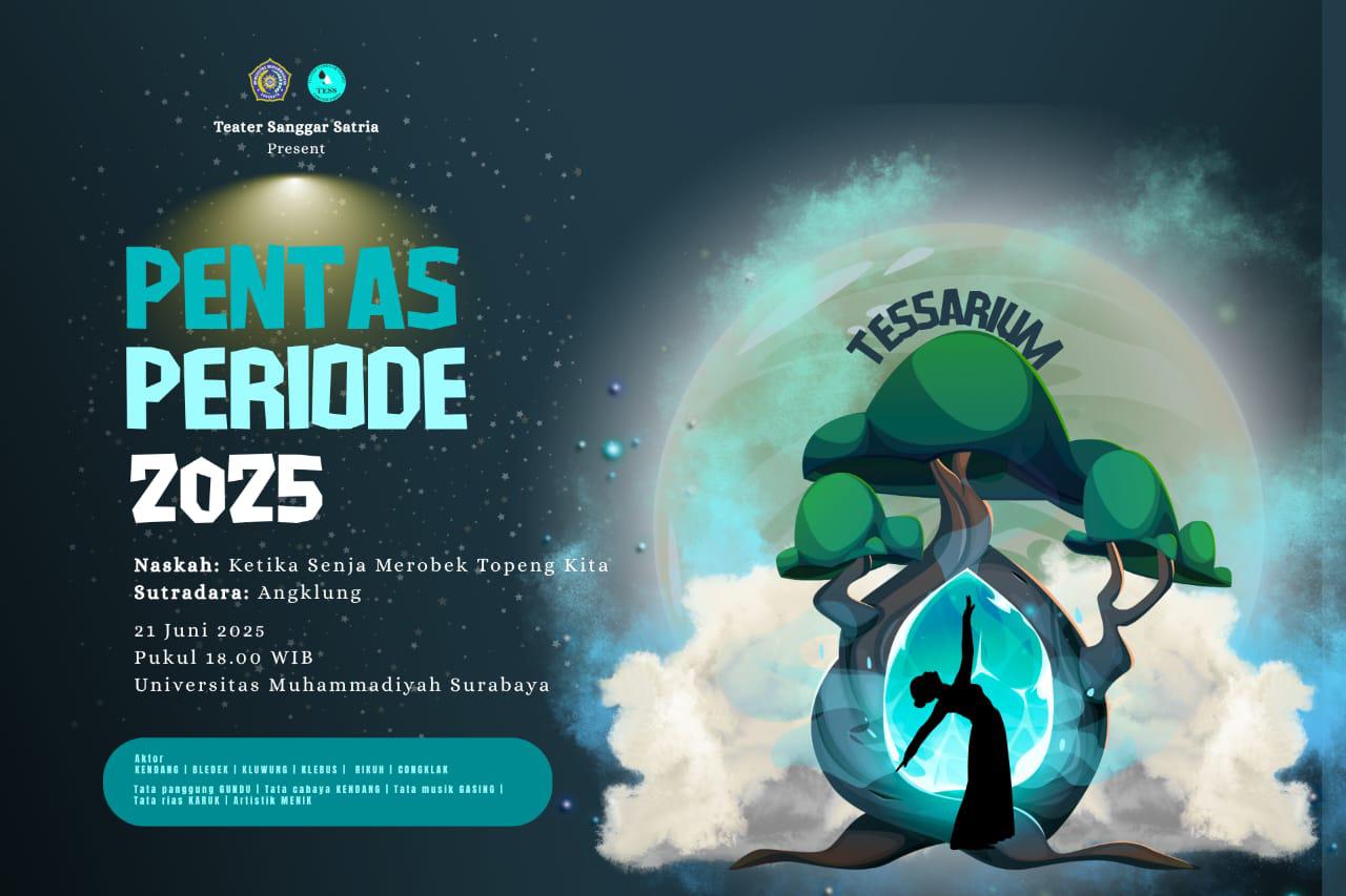 SURABAYA, PIJARNEWS.COM—Dalam rangka memperingati 24 tahun kiprah berkesenian, UKM Teater Satria Universitas Muhammadiyah Surabaya (UM Surabaya) mempersembahkan Pentas Periode 2025 dengan judul “TESSARIUM: Ketika Senja Merobek Topeng Kita”. Kegiatan ini akan digelar pada Sabtu (21/6/2025) pukul 18.00 WIB di lingkungan kampus UM Surabaya, dan terbuka untu kumum.
