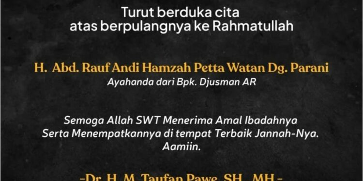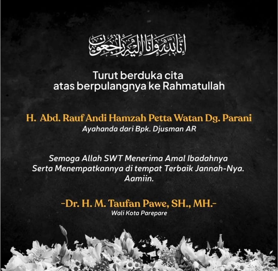 PAREPARE, PIJARNEWS.COM–Wali Kota Parepare, HM Taufan Pawe menyampaikan belasungkawa atas meninggalnya H A Abdul Rauf Hamzah Petta Watan Dg Parani, ayah kandung Djusman AR.