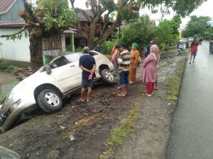 Saksi mata di TKP, Rudianto menyebutkan minibus itu terlihat hilang kendali saat melaju. “Mobil itu dari arah utara, cepat. Menyalip mobil didepannya. Tapi bannya masuk lubang. Mobil itu lalu oleng ke kanan, dan terjungkal ke got,” urainya.