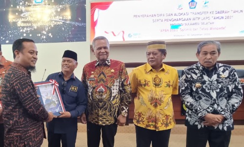 Bupati Enrekang Muslimin Bando hadir langsung menerima penghargaan yang diteken oleh Menteri Keuangan Sri Mulyani dari Gubernur Sulsel.