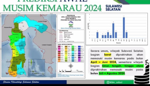 BMKG Sulsel memprediksi awal musim kemarau 2024 umumnya diprediksi pada bulan April 2024, terjadi di 2 ZOM (zona musim) atau daerah. Sementara, puncak kemarau di tahun 2024 akan terjadi pada pada Agustus 2024 yang terjadi pada 19 ZOM.