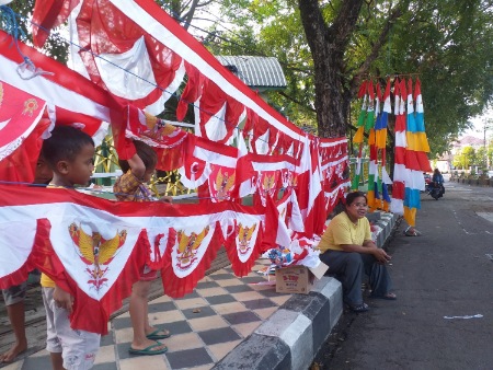 Ernawati Sudah 18 tahun menggeluti usaha berjualan pernak pernik Agustusan, seperti Bendera dan umbul-umbul, namun sejak pandemi covid-19, penjualannya menurun cukup drastis. Meski sepi pembeli, Ernawati mengaku tetap bersyukur.