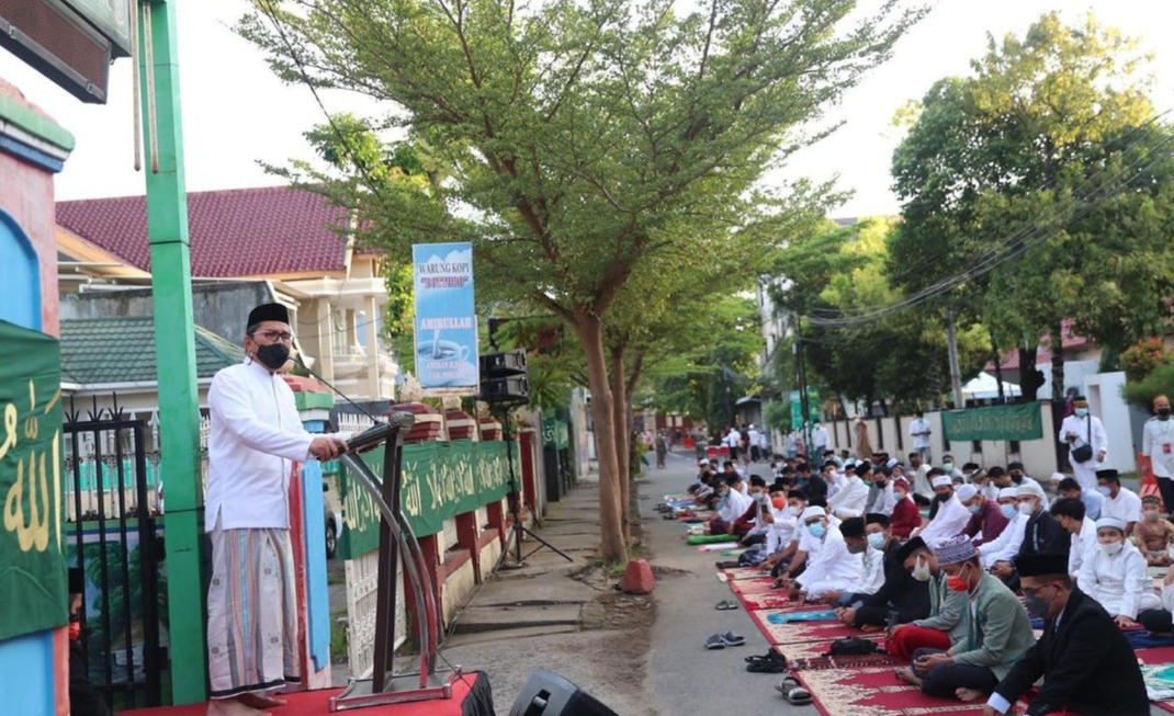 MAKASSAR, PIJARNEWS.COM–Wali Kota Makassar, Danny Pomanto bersama warga sekitar mengikuti pelaksanaan Salat Idul Fitri 1442 H di area kediamannya, Jalan Amirullah, Kamis pagi (13/5/2021). Pelaksanaan salat idul Fitri tersebut tetap menerapkan protokol kesehatan. Yakni jemaah menjaga jarak saat salat dan tetap mengenakan masker.