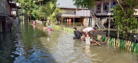 Akibat banjir ini aktifitas warga terganggu, Rabu pagi warga tampak membersihkan limbah kayu, selain itu untuk beraktivitas warga juga harus menggunakan rakit.