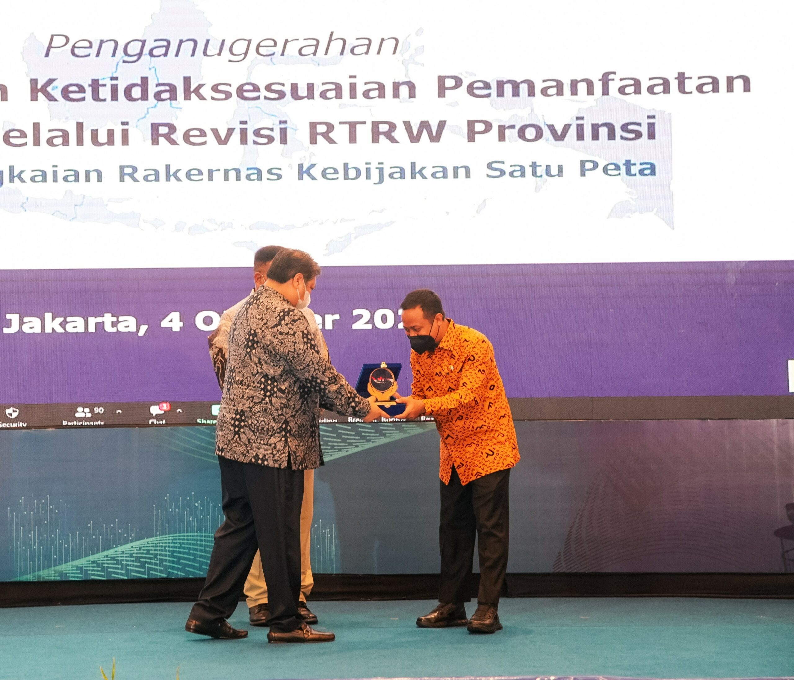 Penghargaan diserahkan pada Rapat Kerja Nasional Kebijakan Satu Peta yang diselenggarakan oleh Kementerian Koordinator Bidang Perekonomian RI, di Hotel Borobudur, Jakarta Pusat, Selasa (4/10/2022).