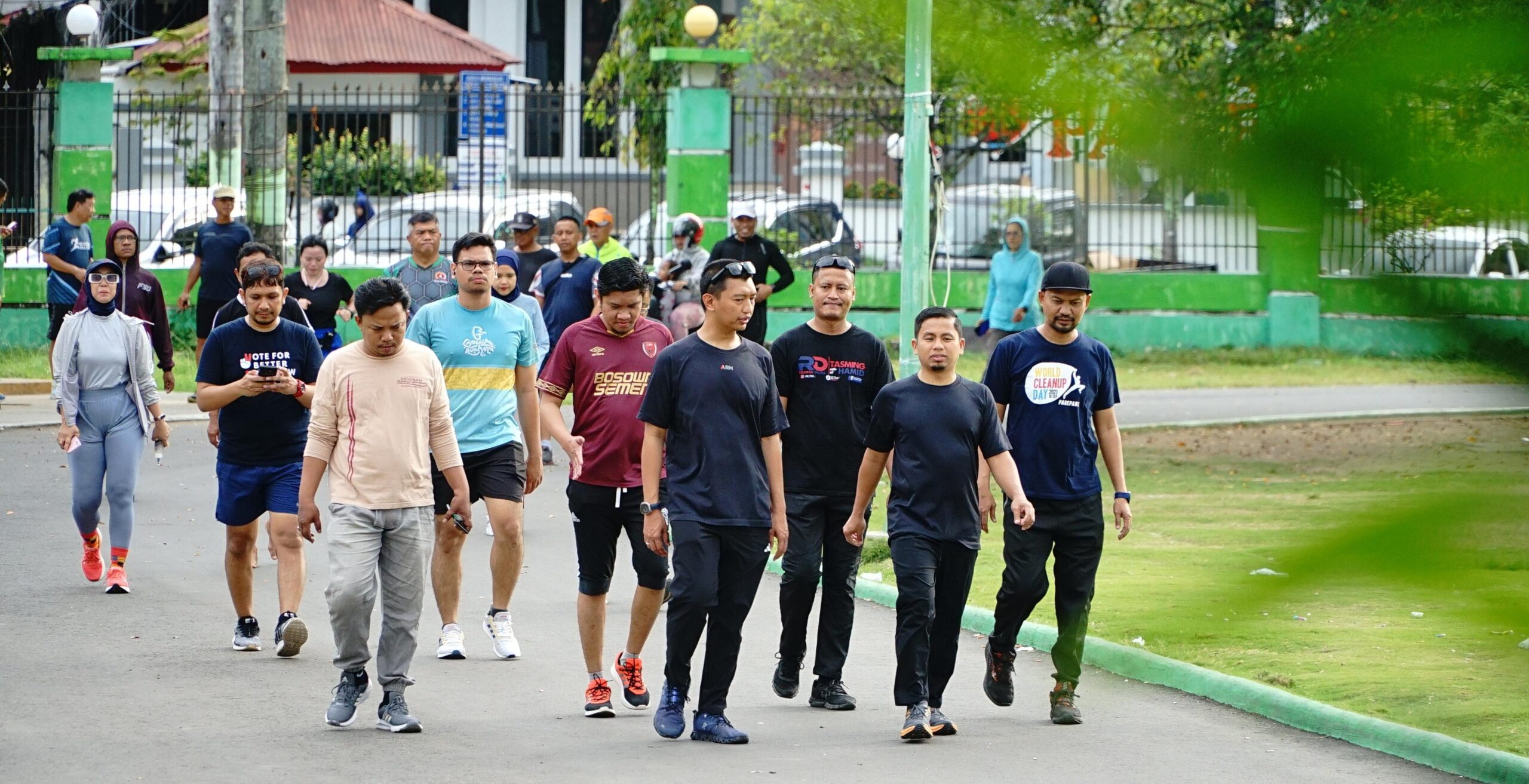 PAREPARE, PIJARNEWS. COM–Calon Walikota Parepare H Tasming Hamid jogging bersama dengan Komandan Tim Kampanye Nasional Pemilih Muda (TKN Fanta) Prabowo-Gibran, Muhammad Arief Rosyid Hasan di Lapangan Andi Makkasau, Kamis (25/7/2025).