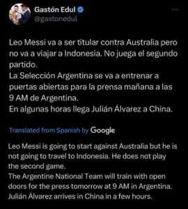 “Leo Messi akan memulai melawan Australia tetapi dia tidak akan melakukan perjalanan ke Indonesia. Dia tidak memainkan game kedua,” tulisnya seperti yang dikutip Pijarnews.com @gastonedul.