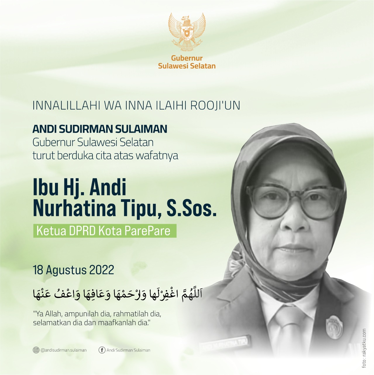 “Innalilahi Wa Innailaihi Rojiun. Atas nama pribadi, Pemerintah Provinsi dan Masyarakat Sulawesi Selatan menyampaikan rasa duka dan turut berbelasungkawa atas meninggalnya Ketua DPRD Kota Parepare, Ibu Hj. Andi Nurhatina Tipu, S.Sos,” ucap Andi Sudirman.