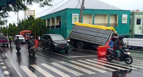 Akibatnya, lanjut dia, saat terperosok ke selokan truk kemudian menimpa pagar RS Sumantri. Sementara, truk yang tidak diketahui Nopolnya meninggalkan TKP setelah lakalantas terjadi.