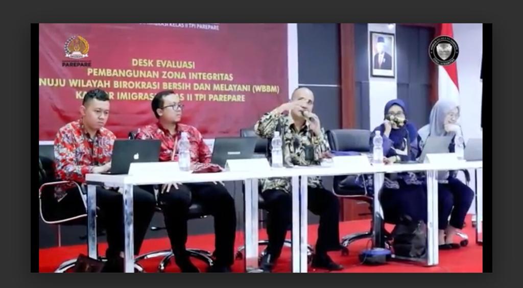 PAREPARE, PIJARNEWS.COM–Kantor Imigrasi Kelas II TPI Parepare mengikuti Desk Evaluasi Pembangunan Zona Integritas menuju Wilayah Birokrasi Bersih Melayani (WBBM) oleh Tim Penilai Internal Inspektorat Jenderal Kementerian Hukum dan HAM RI yang bertempat di Aula Kantor Imigrasi Parepare, Jumat (12/5/2023).