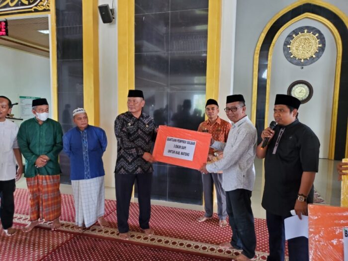 Lalu dilaksanakan penyembelihan Sapi Kurban Presiden dan Sapi Pj. Gubernur Sulbar di Masjid Al Ikhlas, Kelurahan Simboro, Mamuju.