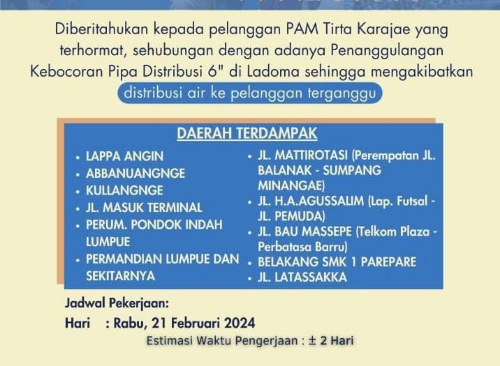 PAREPARE, PIJARNEWSD.COM – Perusahaan Air Minum (PAM) Tirta Karajae Kota Parepare menginformasikan adanya gangguan distribusi air bersih kepada pelanggan, Rabu (21/2/2024).