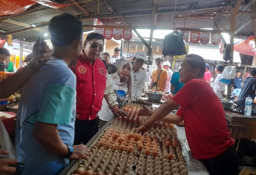Dalam kunjungannya, PJ Wali Kota berinteraksi dengan para pedagang, termasuk pedagang telur, beras, dan daging, serta menanyakan tentang harga kebutuhan pokok dan kondisi perdagangan di pasar.