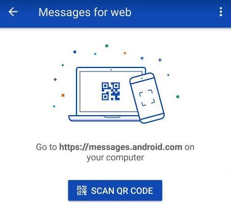 Selanjutnya membuka Android Pesan di ponsel Anda, lalu mengetuk tombol menu di sudut kanan atas dan memilih “Pesan untuk Web” kemudian “Pindai Kode QR”.