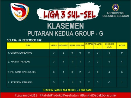 Gasma Enrekang menyapu bersih pertandingan, dengan tiga kemenangan yakni mengalahkan Perspin Pinrang dengan skor 3-1, PS Bank Sulselbar dengan skor yang sama 3-1 dan mengalahkan Gasta Takalar 2-1.