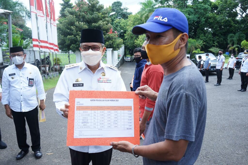 Dalam kesempatan itu, Taufan Pawe secara simbolis membagikan kupon pasar murah kepada masyarakat dari perwakilan empat kecamatan.