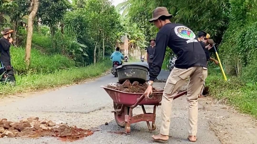 Tampak di video para pemuda tersebut kompak menambal jalan dengan tanah dan pecahan batu bata yang diberikan oleh warga sekitar.