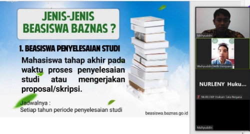 PAREPARE, PIJARNEWS.COM – Lembaga Penjaminan Mutu (LPM) Institut Agama Islam Negeri (IAIN) Parepare melalui Pusat Pengembangan Mutu Karier Mahasiswa dan Alumni dan Tim Carer Development Center (CDC) menggelar Sharing Session Beasiswa Baznas, via zoom meeting, Rabu (28/12/2022).