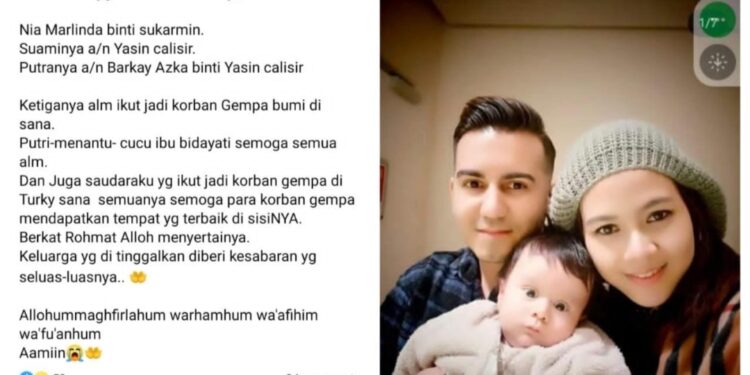 TURKI, PIJARNEWS.COM – Seorang warga negara Indonesia (WNI) bernama Nia Marlinda binti Sukarmin dilaporkan meninggal dunia dalam insiden gempa bumi yang mengguncang Turki bagian selatan.
